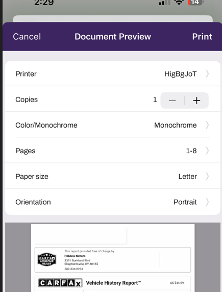- A document preview will appear, from here click the button labeled "Printer" to select other printers *Looks like below snip*
